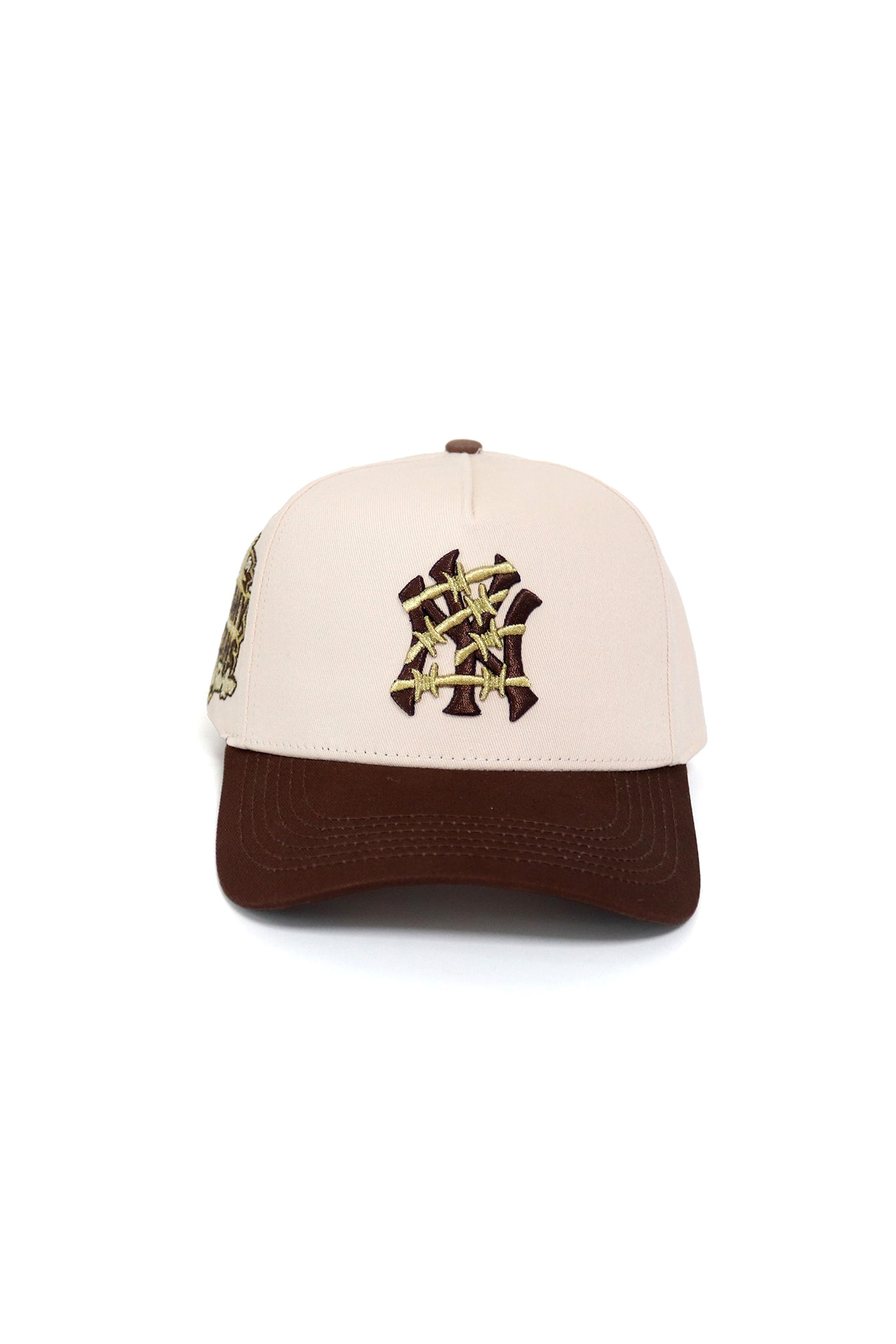 - A FRAME SNAPBACK CAP WITH EMBROIDERED NY LOGO WITH METALLIC THREAD WRAPPED AROUND BARBED WIRE.